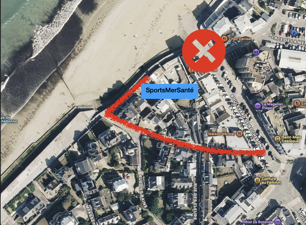 En raison des travaux sur la cale de Rochebonne (prévus jusqu'à fin mars 2026), vous pouvez accéder au local des Mouettes par ce tracé rouge, ou bien par la digue!